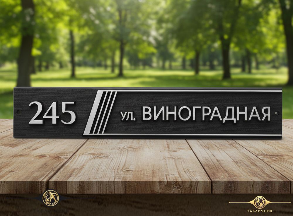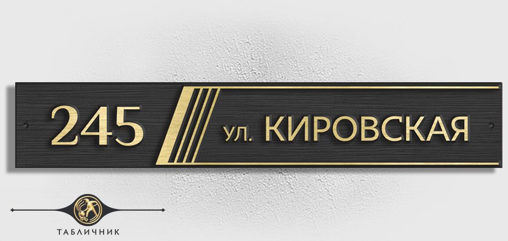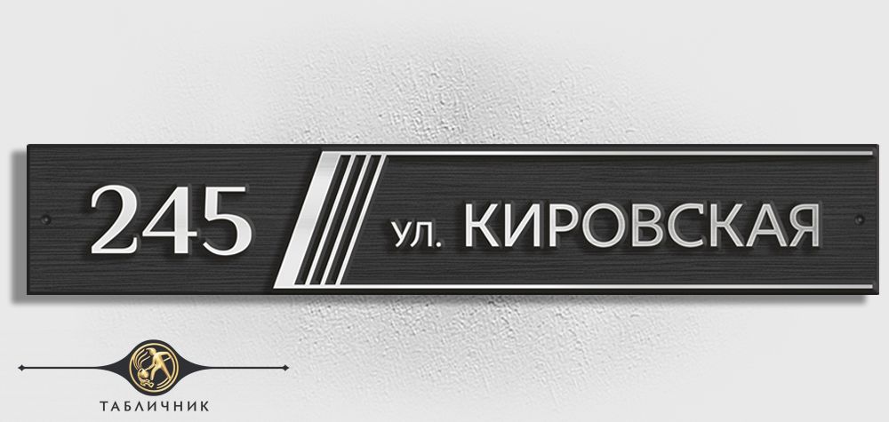 Адрес вписан в вытянутый прямоугольник, украшенный лишь серией косых полосок. Декоративный элемент добавляет динамики и визуально структурирует информацию, отделяя номер дома от названия улицы.