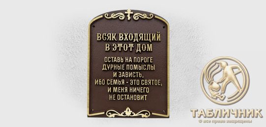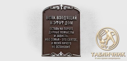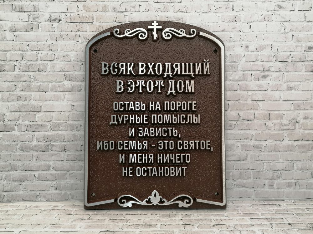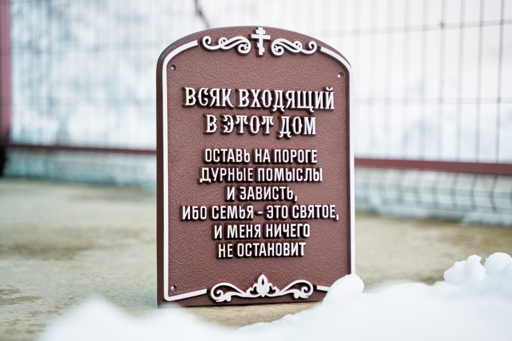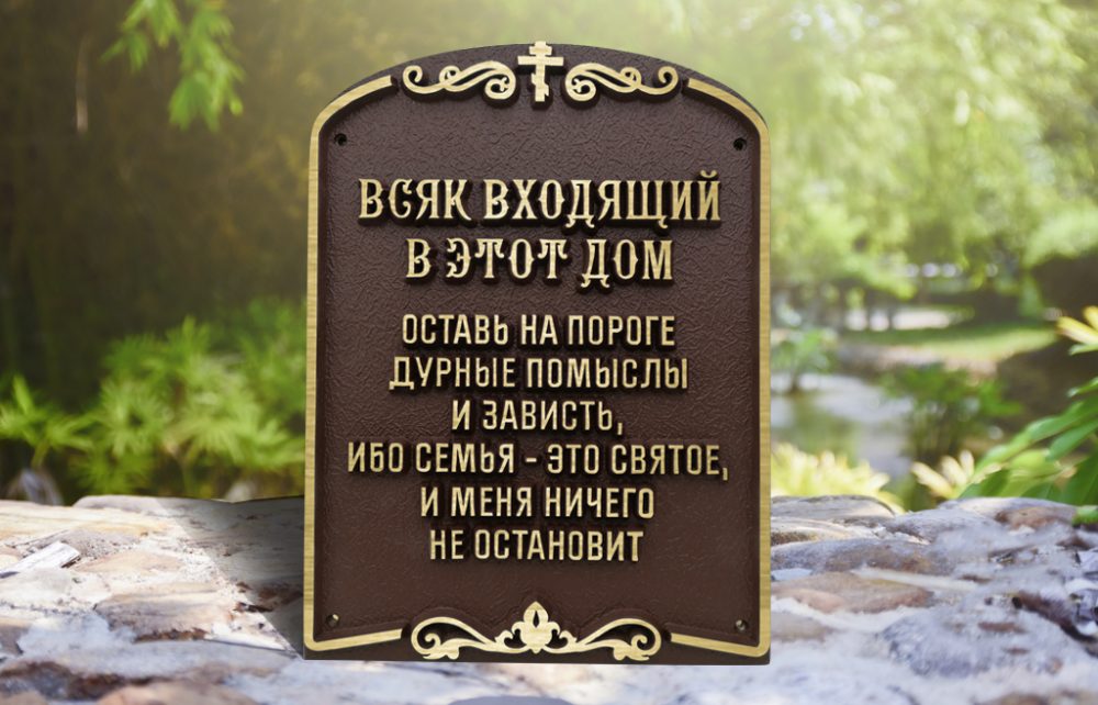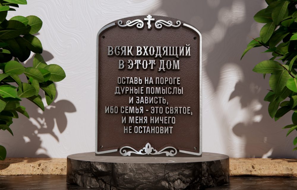В дизайне использован особый церковный шрифт с высокими и узкими буквами. Его дополняет минималистичный орнамент по краю. Табличка подойдёт и тем, кто серьёзно относится к оберегам, и просто верующим людям, которым по душе православная символика.